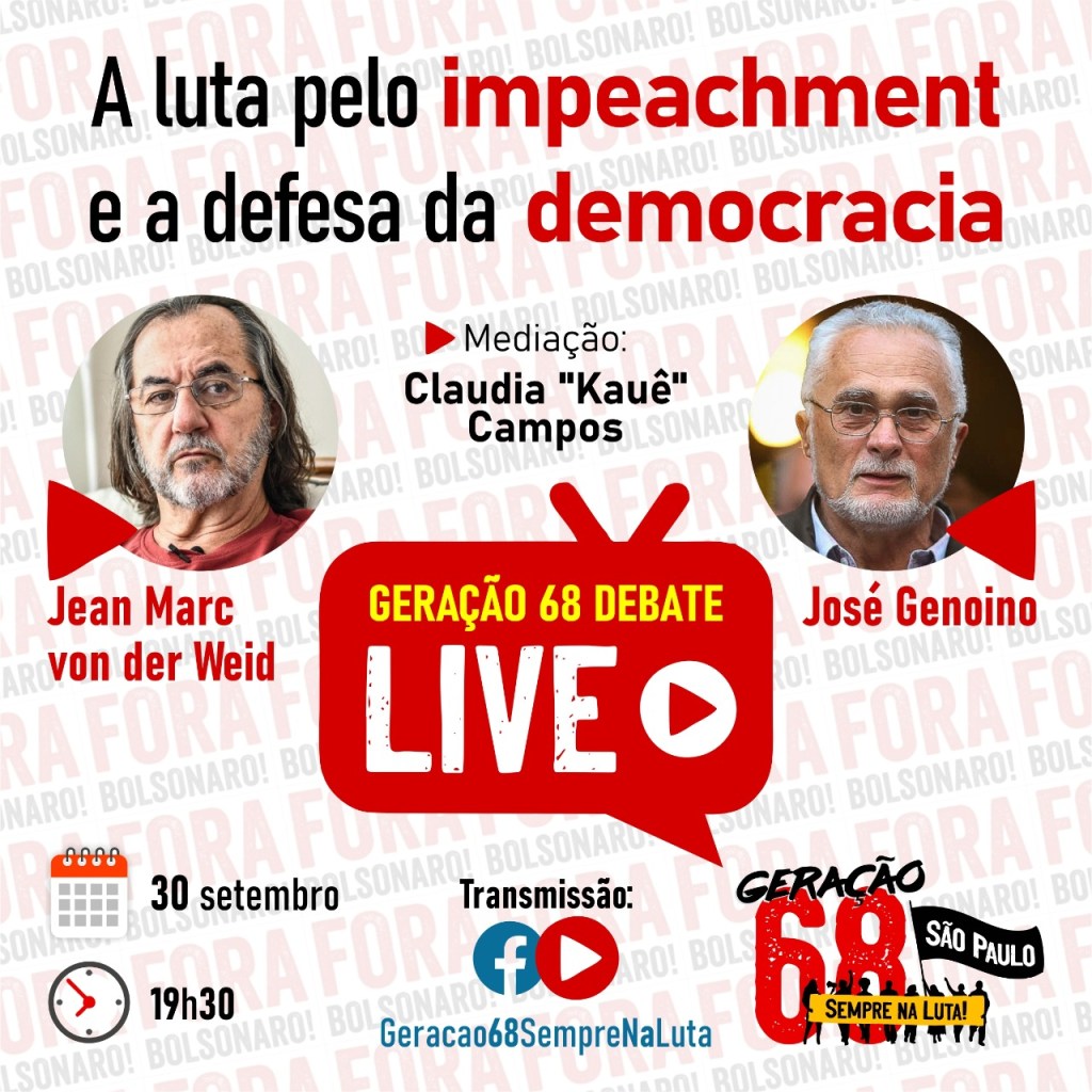 Acontece nesta quinta-feira (30), a primeira live realizada pelo Movimento Geração 68/São Paulo com a presença de José Genoíno, Jean Marc Von der Weid e Cláudia de Arruda Campos, a Kauê. A atividade, que começa às 19h30, é fruto de um amplo esforço coletivo de analisar a conjuntura e projetar caminhos.
